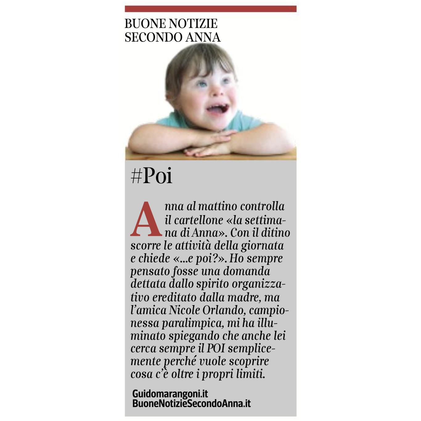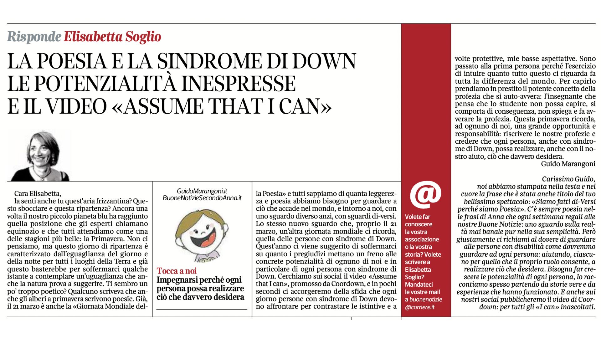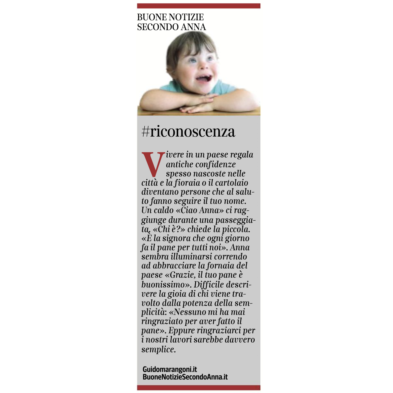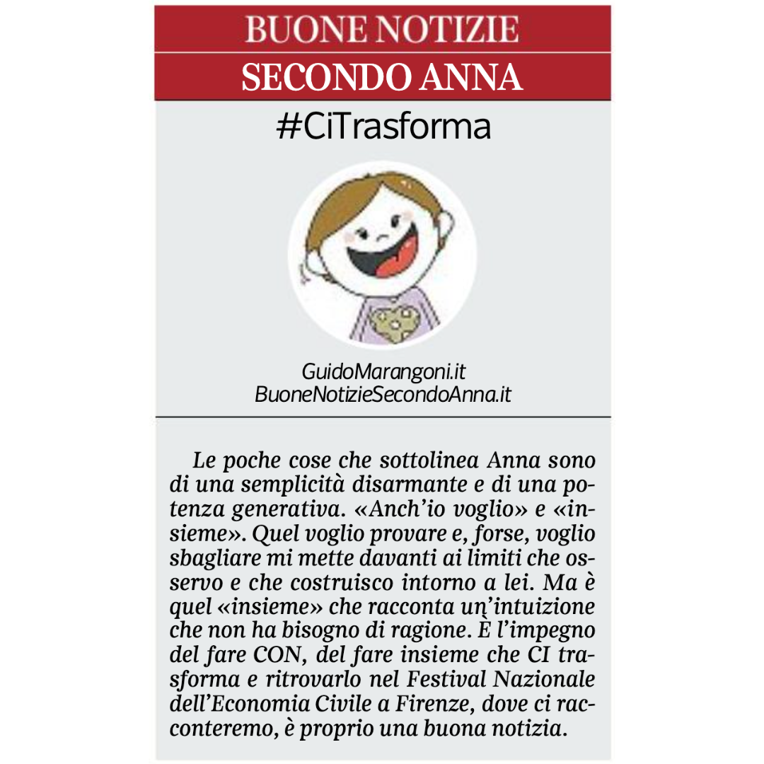 Collaboro con il Corriere della Sera, nell'inserto "Buone Notizie", con uno spazio settimanale dal titolo "Buone notizie secondo Anna".